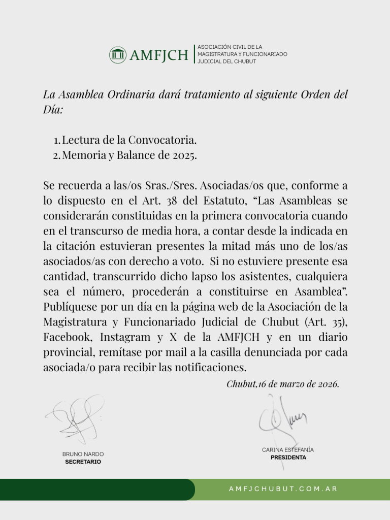Convocamos a las/os asociadas/os de la Asociación de la Magistratura y Funcionariado Judicial del Chubut a participar de la Asamblea Ordinaria que se realizará el viernes 17 de abril a las 18:30 h, en modalidad híbrida (presencial en Trelew y virtual vía Zoom). https://us02web.zoom.us/j/86816782092?pwd=zkvZyrFGW298R6c3rjDfxbSu51btTG.1